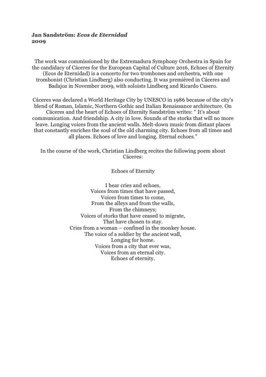 Jan Sandström: Ecos De Eternidad - 2 solo Trombones & Symphony orchestra